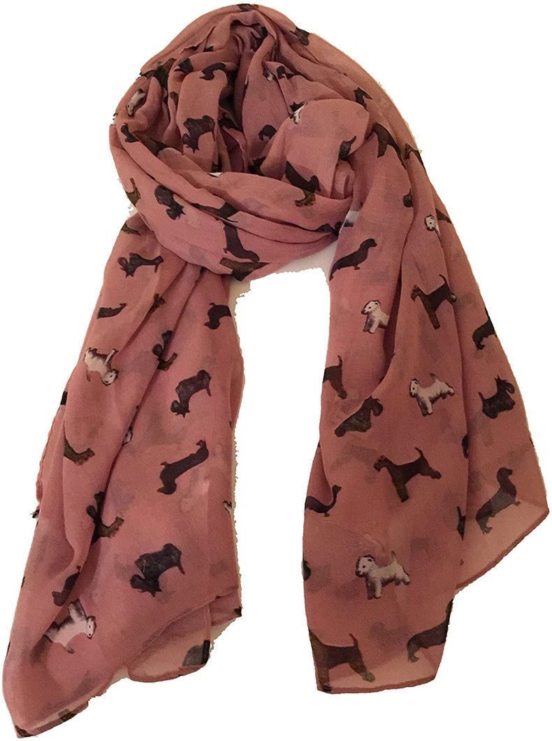 Pamper Yourself Now Pink with Mixed Pooch Dog Design Long Scarf. Sausage Dog, west Ireland Terrier, Wolf Hound