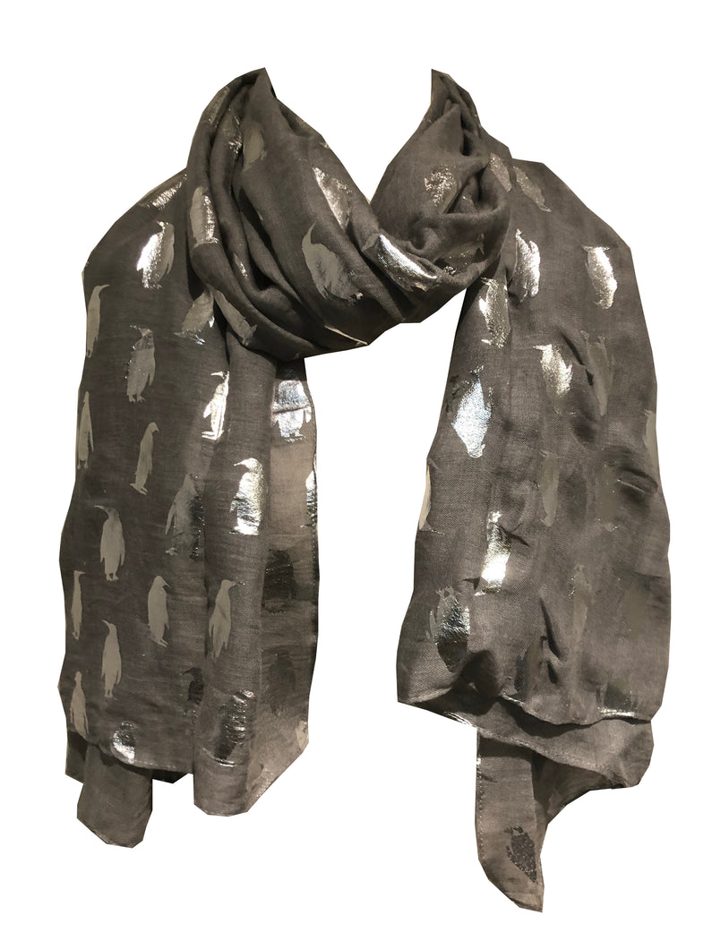 Pamper Yourself Now Grey Silver Penguin Long Soft Scarf