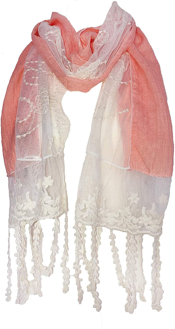 Pamper Yourself Now Orangey Pink with Cream Flower lace Trim with Tassel Scarf
