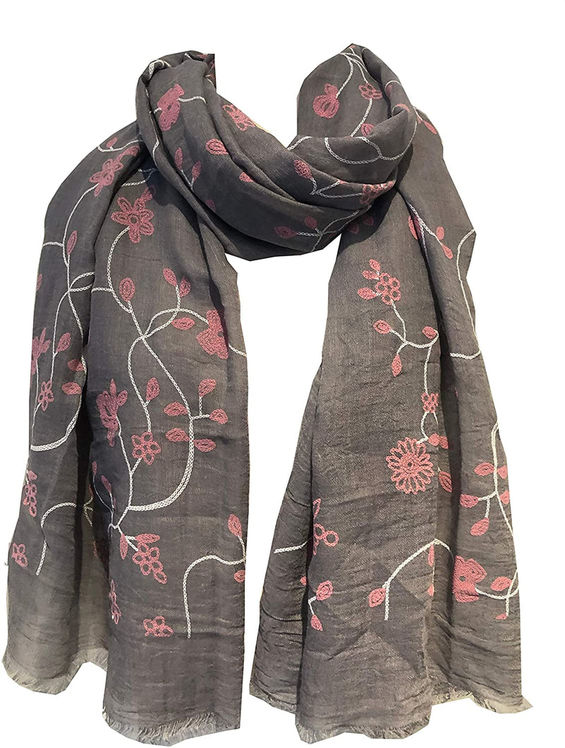 Pamper Yourself Now Grey with Pink Embroidered Flowers and Leaf Design Long Scarf/wrap with Frayed Edge