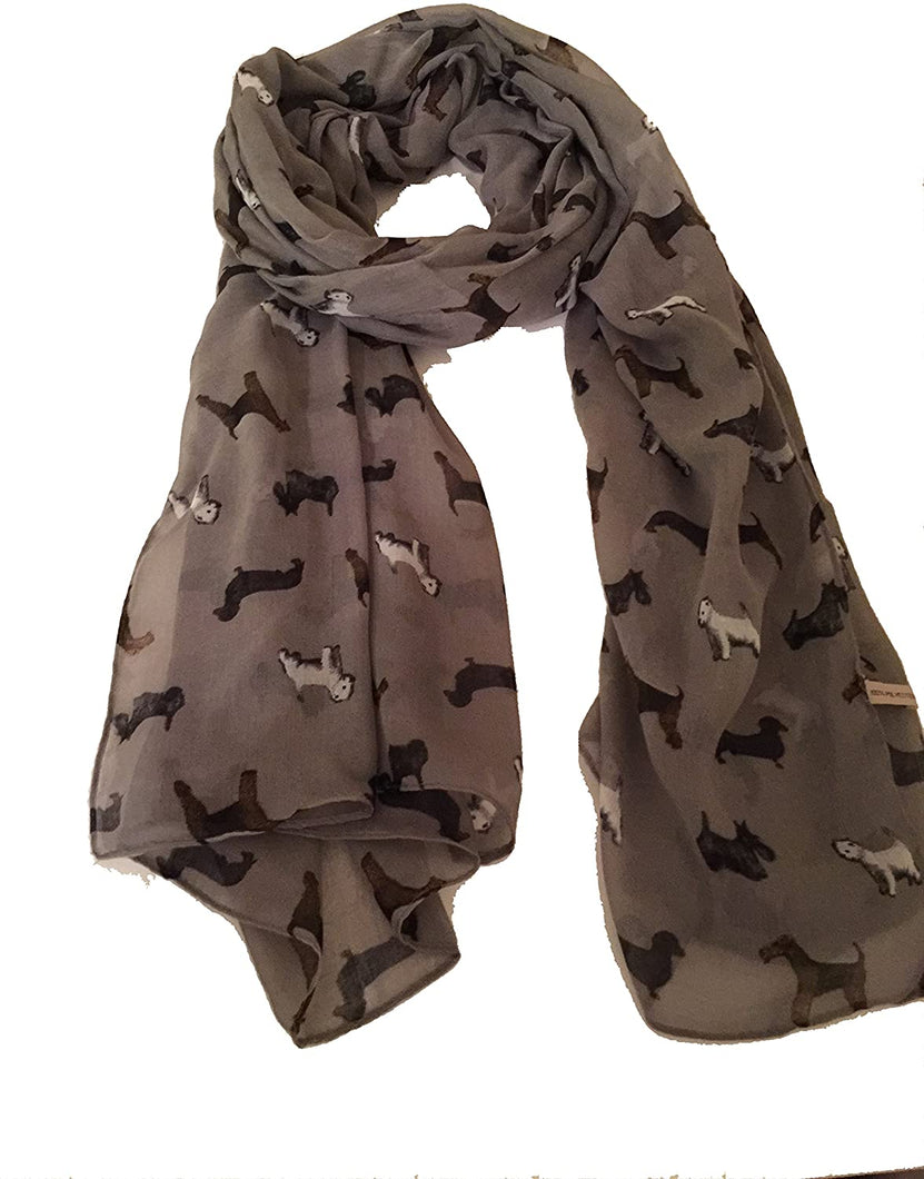 Pamper Yourself Now Grey with Mixed Pooch Dog Design Long Scarf. Sausage Dog, west Ireland Terrier, Wolf Hound