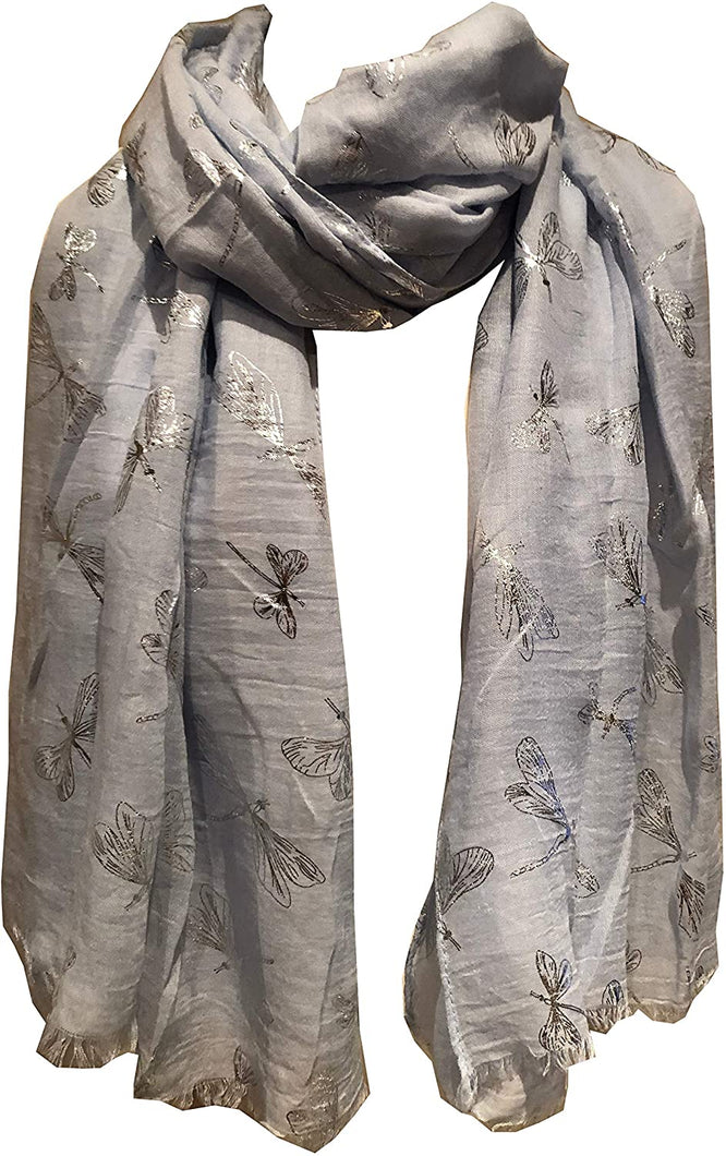 Pamper Yourself Now Sky Blue with Silver Foiled Glitter Dragonfly Design Long Scarf/wrap