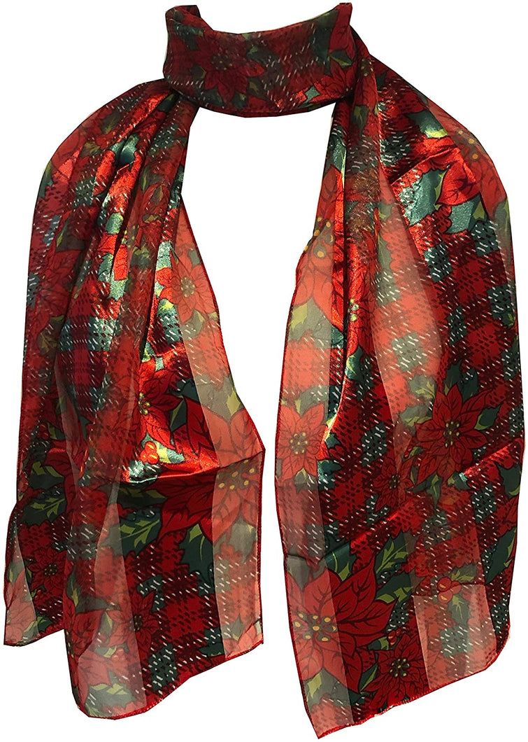 Pamper Yourself Now Red with red and Green Poinsettia Flower Design Scarf Thin Pretty Christmas Scarf