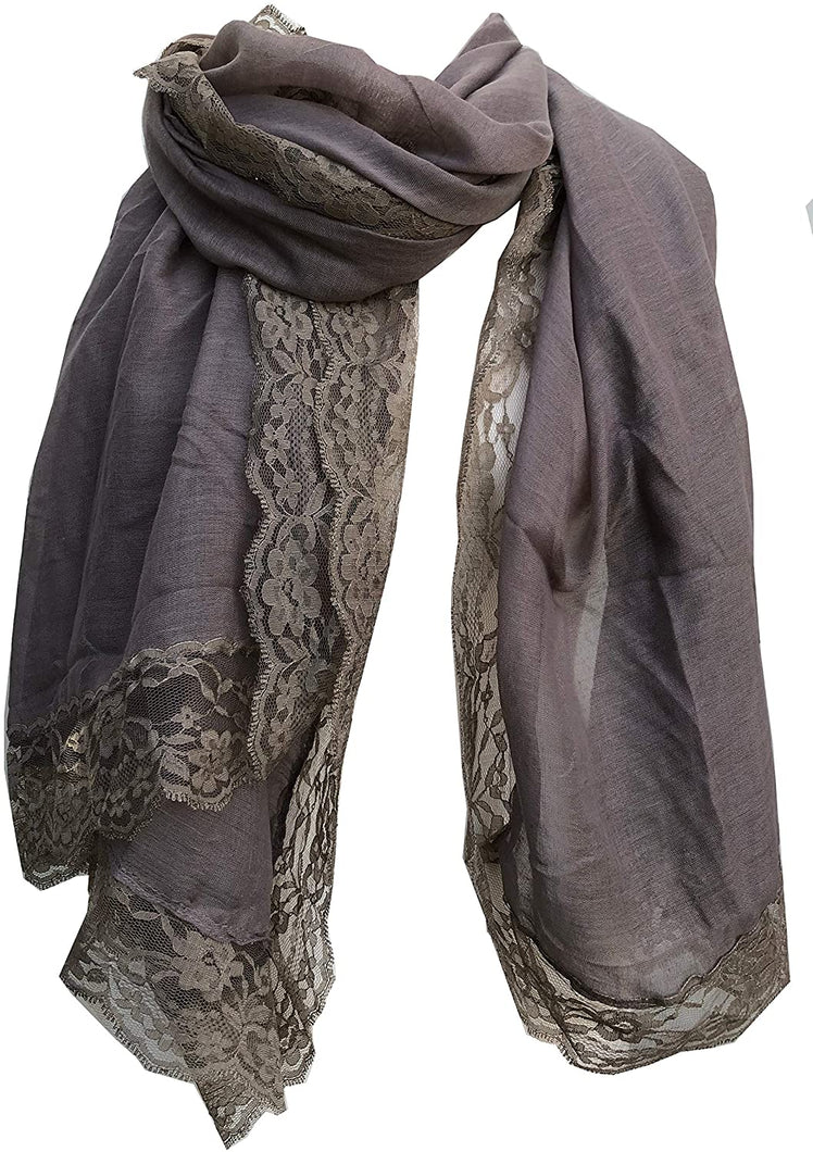 Pamper Yourself Now Brown Plain Long Soft Scarf with lace Trim