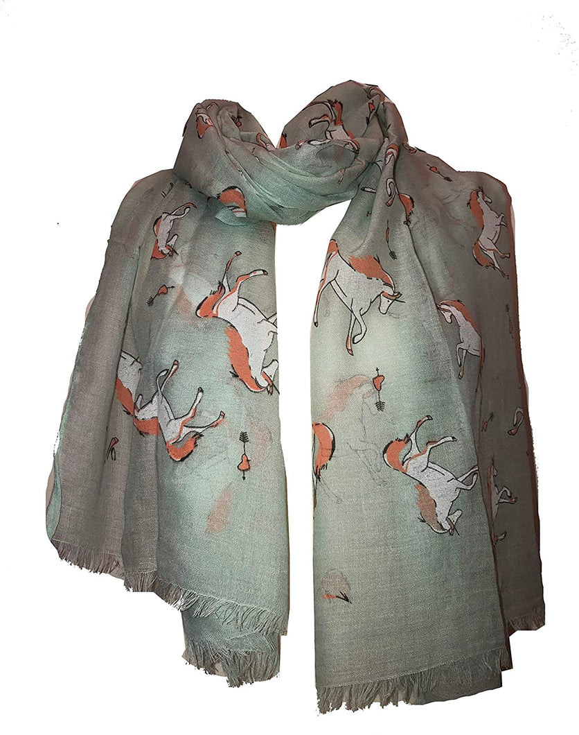 Pamper Yourself Now Green Unicorn Design Long Scarf/wrap with Frayed Edge