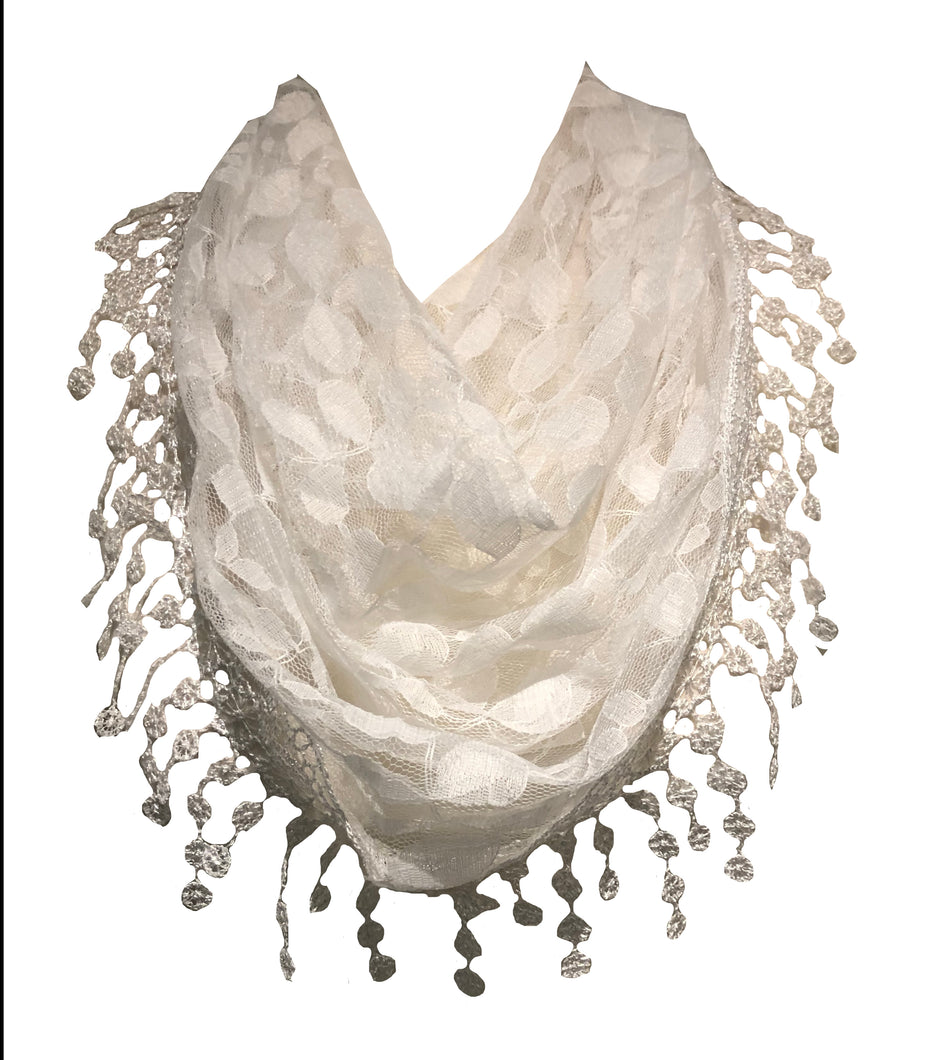 Pamper Yourself Now White Leaves Designs lace Triangle Scarf. a Lovely Fashion Item. Fantastic Gift