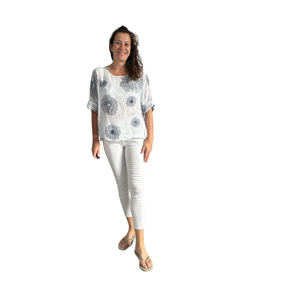 White with Navy Dandelion stretchy dress with cap sleeves for women (A160)