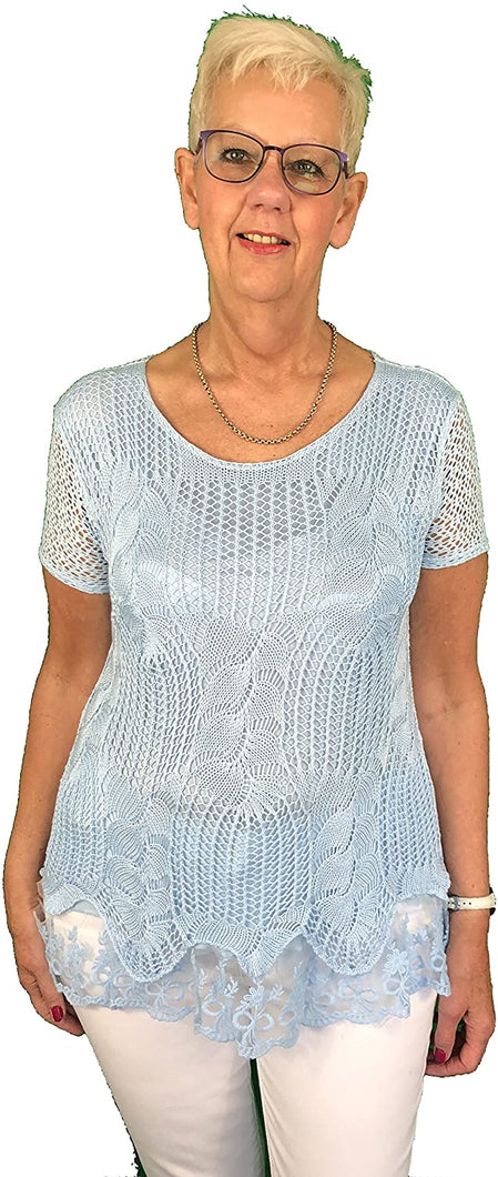 Pamper Yourself Now ltd Ladies Sky Blue Crochet Lace Short Sleeve top.Made in Italy (AA60)
