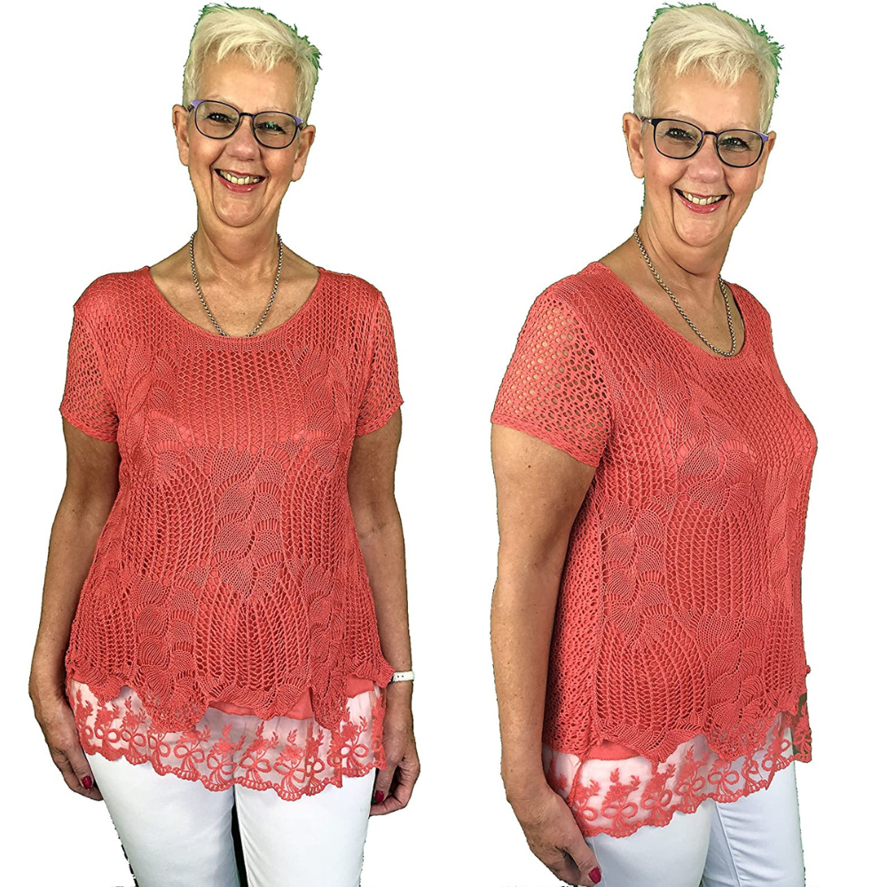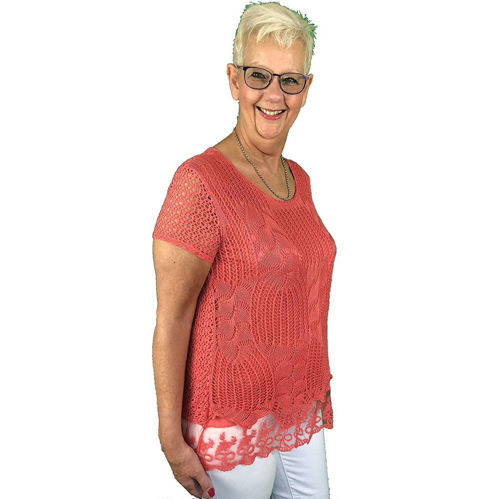 Ladies coral crochet lace short sleeve top. Lovely Italian top. 95% viscose +5% elastane